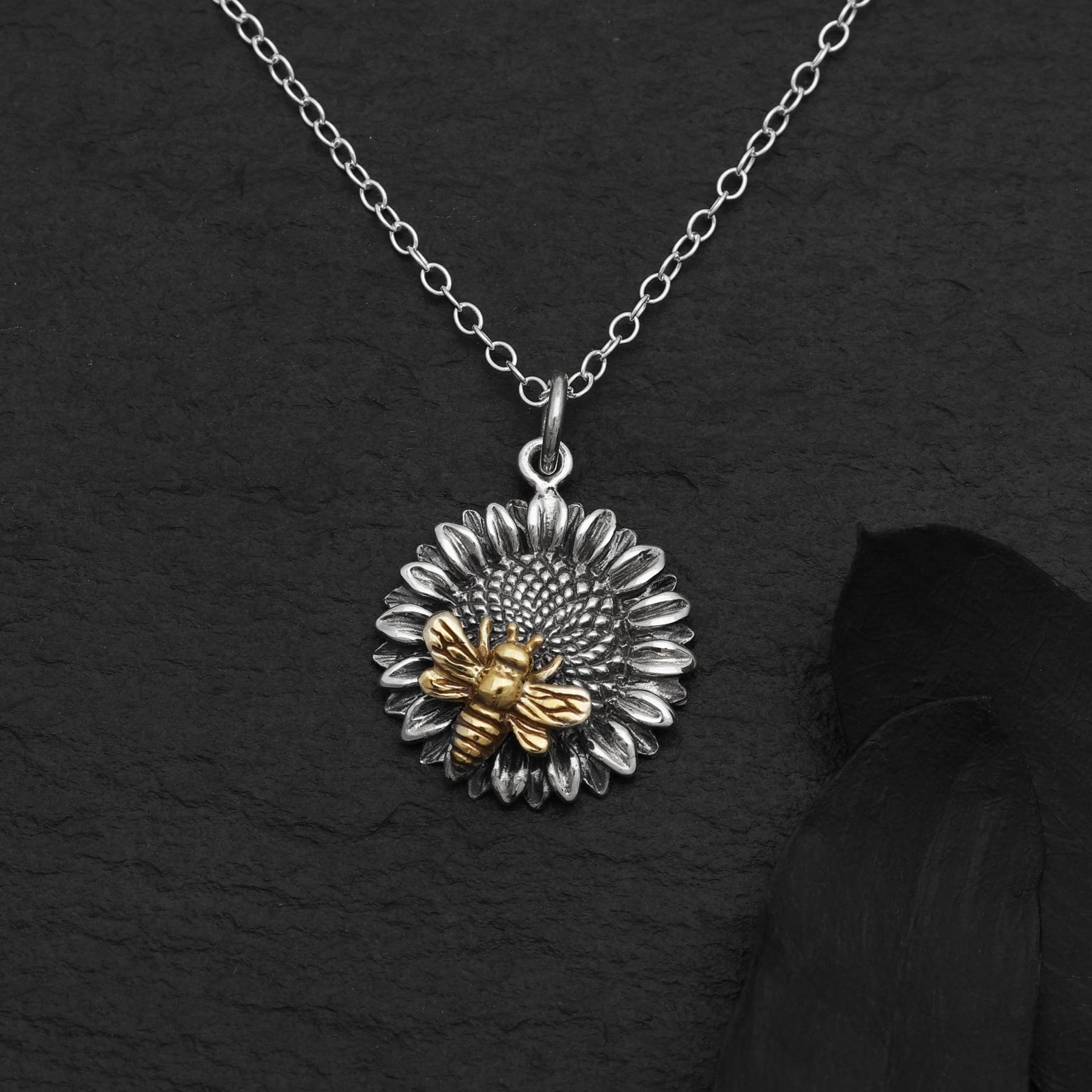Sterling Silver Sunflower Necklace with Bronze Bee