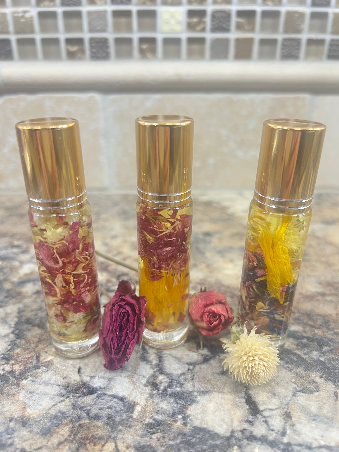 Processed using cold oil flower infusion for a natural yet luxurious non-greasy oil treatment, this specially formulated cuticle/nail oil is made with natural ingredients including jojoba, avocado and olive oils, plus a blend of essential oils perfect for your skin and nails. Flowers selected vary and may include rose petals, lavender, and geranium.