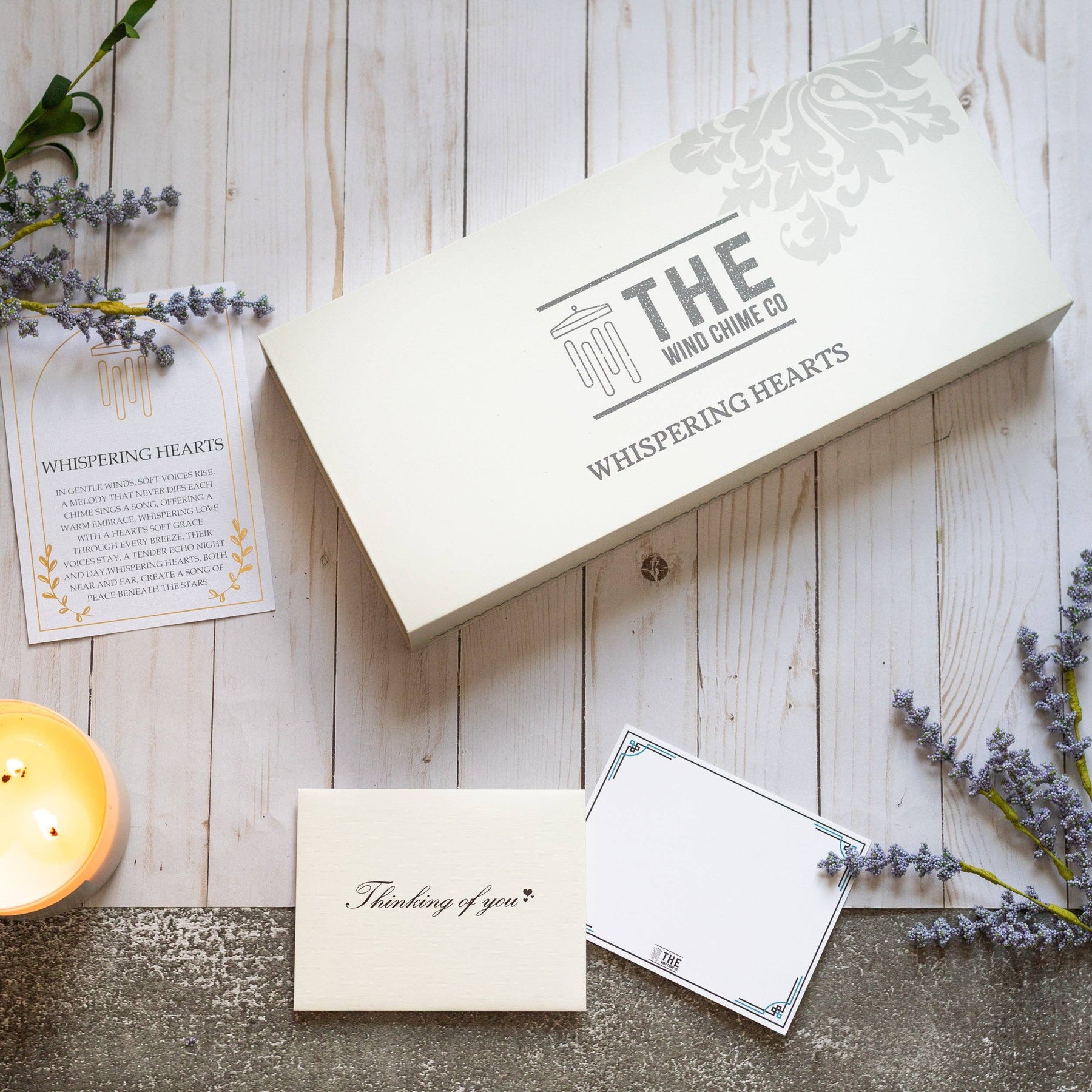 Each chime Whispering Hearts™ has a gift box, complete with: * A “Thinking of You” envelope * A display-ready 5x7 Whispering Hearts™ poem card * A blank notecard for gift messages or notes