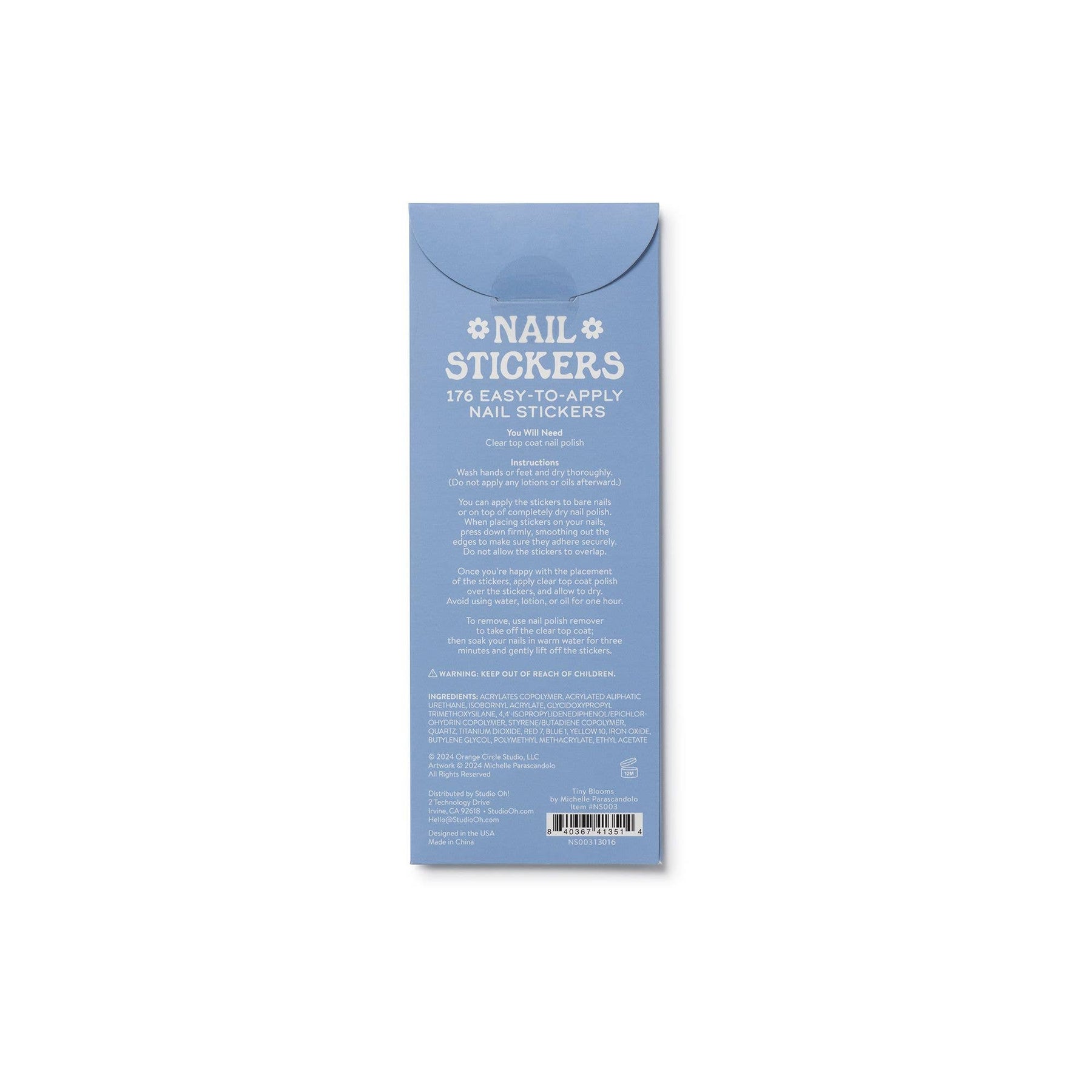 These self-adhesive nail stickers from Studio Oh! offer a quick and easy form of self-expression, allowing you to turn your nails into little works of art! Customize each nail using the on-trend designs and symbols. Each pack contains 176 stickers and is themed to allow for a wide variety of coordinated looks. Works perfectly on both fingers and toes! • Features charming artwork and vibrant colors to express different moods or match any outfit • Can be applied in different patterns to create personalized designs • Includes 176 coordinating nail stickers for both fingernails and toenails 176 nail stickers Package: 2.68"w × 7.43"h (6.8 cm × 18.8 cm)