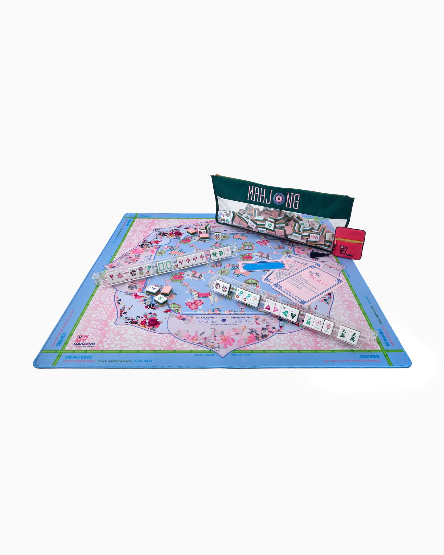 OMM suggested pairings: Amara Tile Set, Light Pink Line Finder, Light Pink Shuffler, Clear Acrylic Rack and Pushers Set, and Cotton Candy Monkey Mahjong Bag